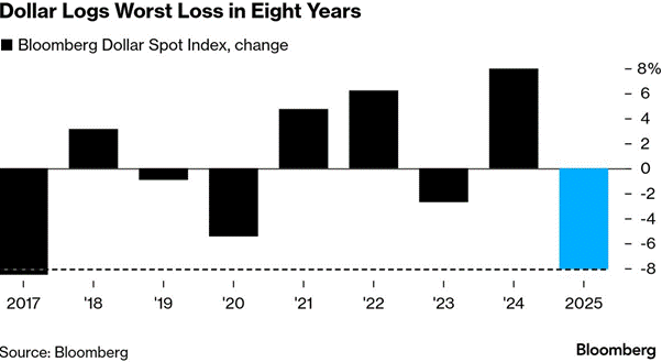 Zanimljivo je da se najveći dio tog pada dogodio u prvoj polovici godine. Zbog toga je 2025. bila najgora (najslabija) godina za dolar u posljednjih 8 godina.